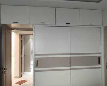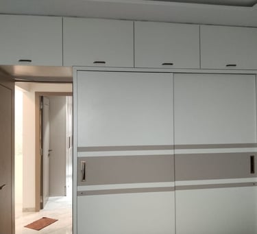 Modular Wardrobe Design: Built-in white wardrobes with mirrored doors and sleek handles that enhance space and elegance.