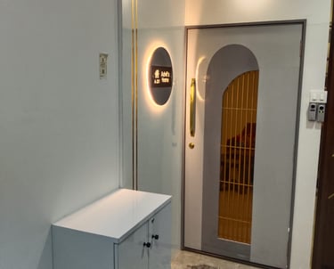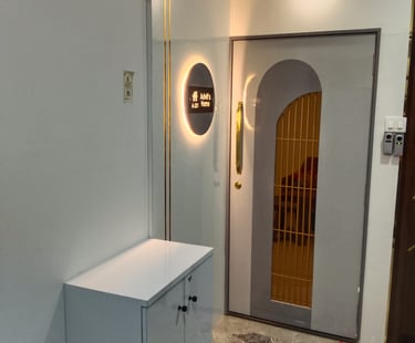 Decorative Entryway: Arched doorway with golden grillwork, ambient lighting, and compact cabinetry for a welcoming entrance.