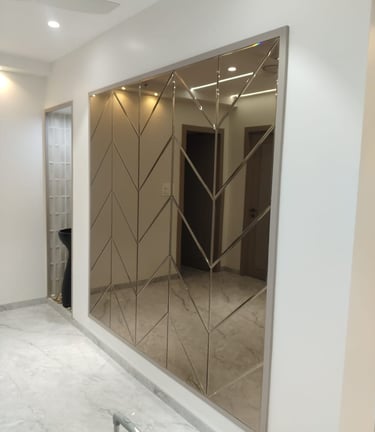 Statement Mirror Wall: Geometric mirror design that adds depth, elegance, and a touch of modern flair to the space.