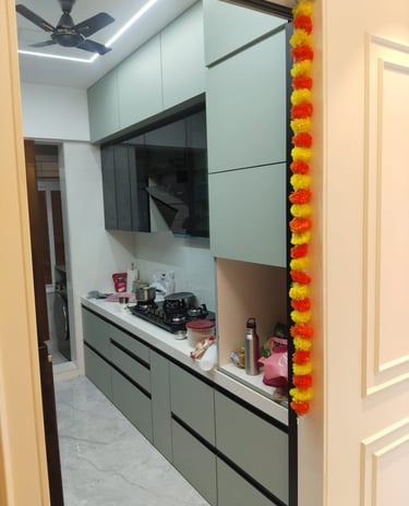 Integrated Storage Solutions: Muted green wall cabinetry with horizontal accents and overhead compartments for clean organization.