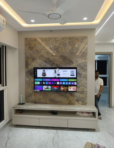 Entertainment Wall Setup: Marble paneling, floating cabinets, and recessed lighting around the TV zone for a sleek, immersive experience.